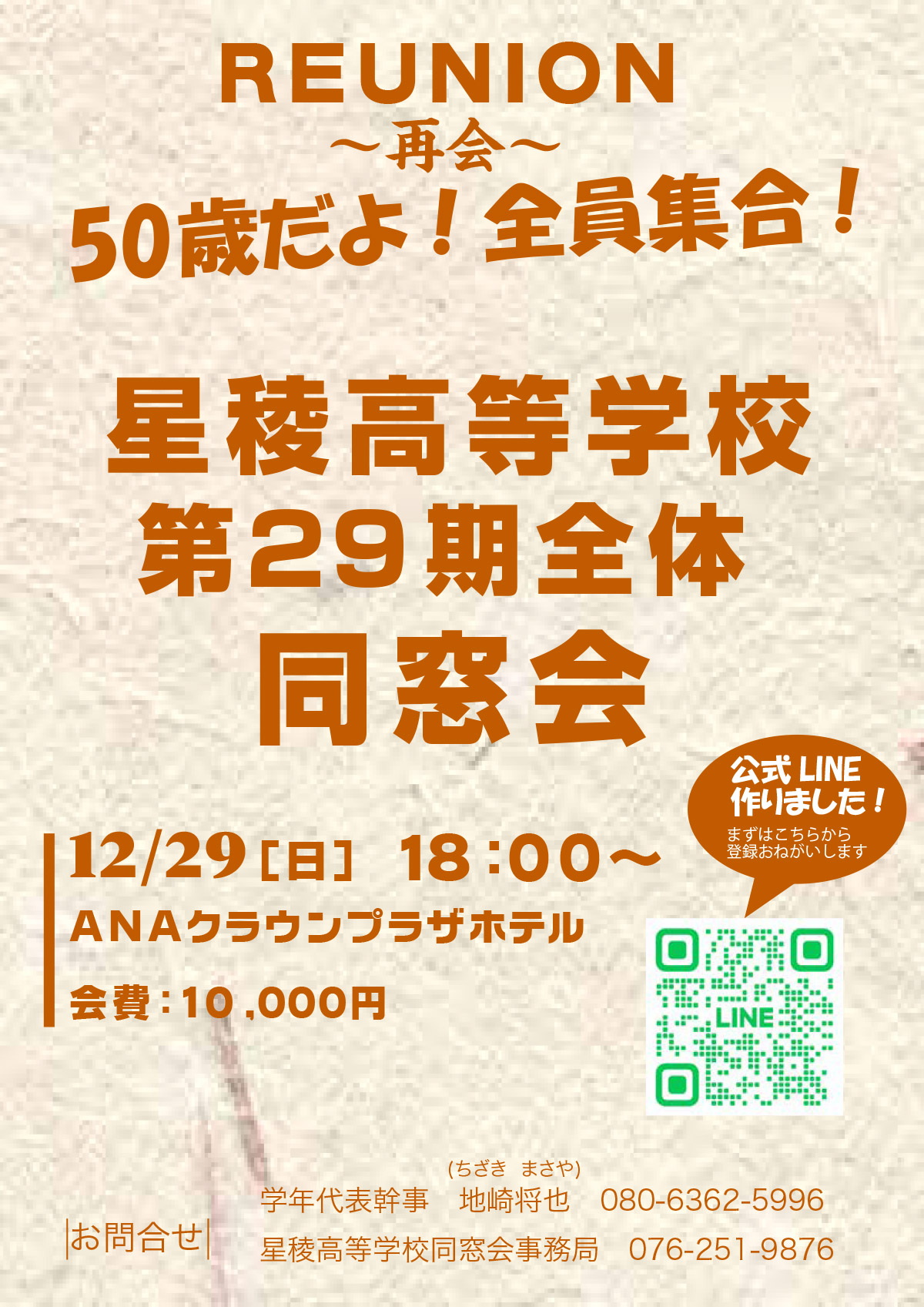 「星稜高等学校第29期全体同窓会」開催のお知らせ ~50歳だよ!全員集合!~